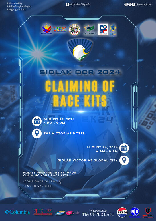 Race Kits will be available for claiming starting Aug 23, 2024 (3:00pm-7:00pm) at the Victorias Hotel and will continue on the day of the race (August 24) from 4:00 AM at the race venue (Sidlak Victorias Global City).Please prepare the ff. Upon claiming your race kits: